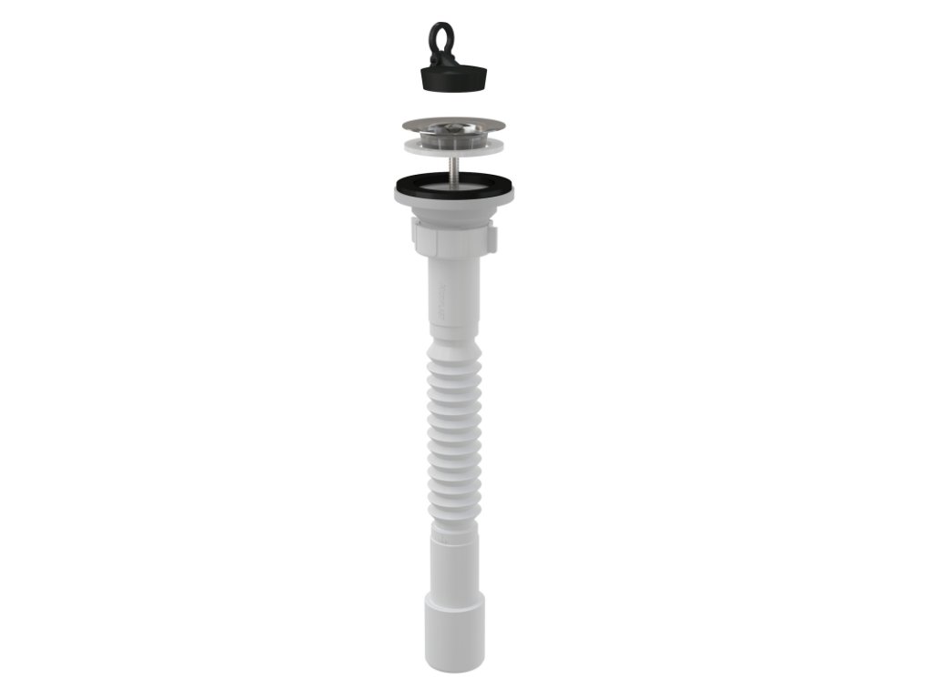 Flexi pripojenie G 5/4" × DN 32/40, plast + Výpusť umývadlová G 5/4" s nerezovou mriežkou Ø 62 mm, gumová zátka