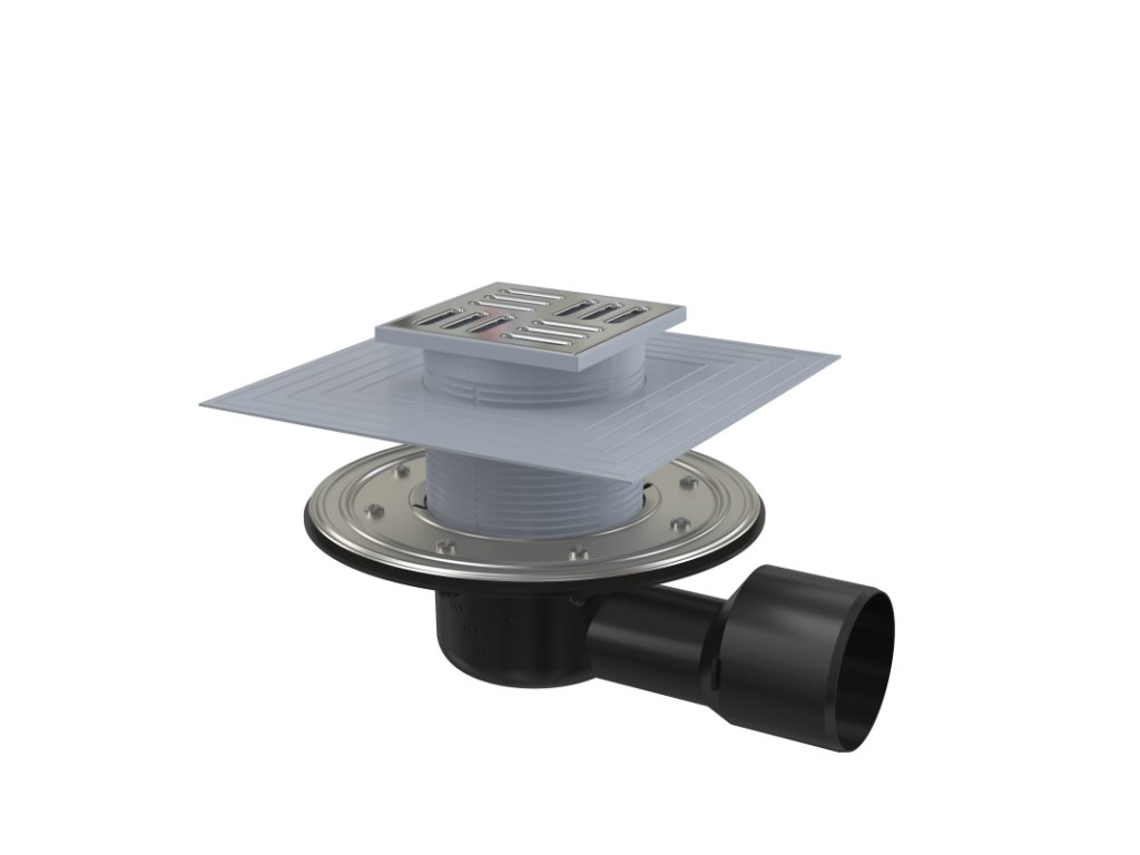 Podlahová vpusť 105×105/50/75 mm bočná, mriežka nerez, nerezová príruba a límec 2. úrovne izolácie, vodná a suchá zápachová uzávera