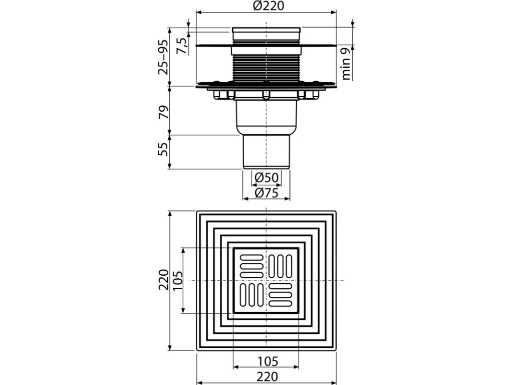 Podlahová vpusť 105×105/50/75 mm priama, mriežka nerez, nerezová príruba a límec 2. úrovne izolácie, vodná a suchá zápachová uzávera