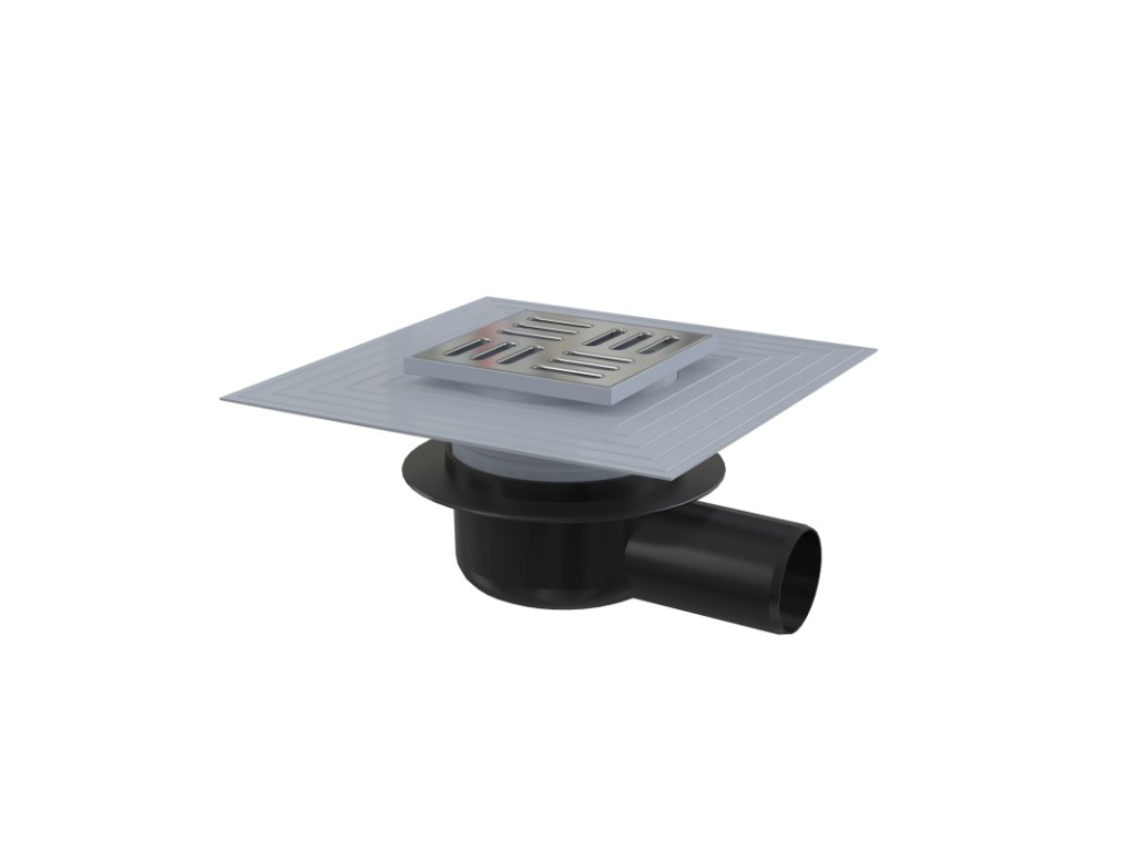 Podlahová vpusť 105×105/50 mm bočná, mriežka nerez, límec 2. úrovne izolácie, suchá zápachová uzávera
