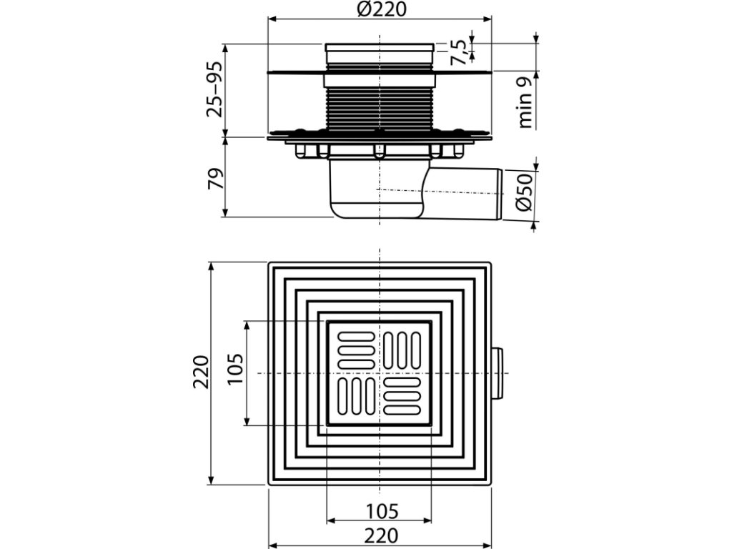 Podlahová vpusť 105×105/50 mm bočná, mriežka nerez, nerezová príruba a límec 2. úrovne izolácie, kombinovaná zápachová uzávera SMART