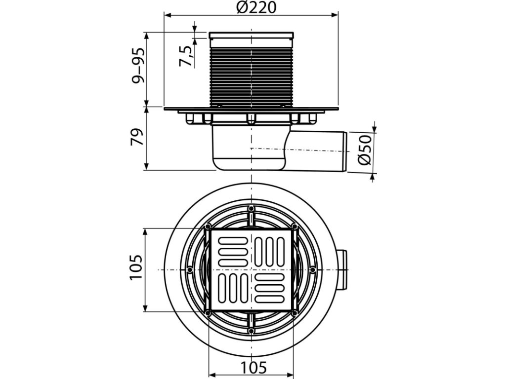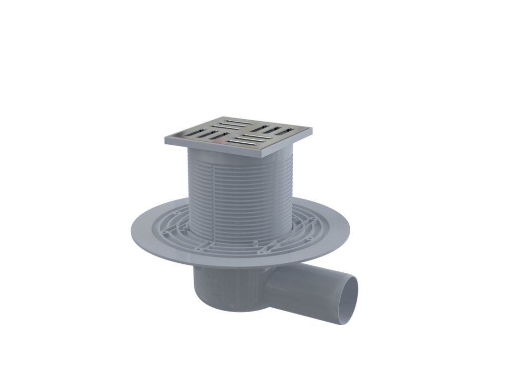 Podlahová vpusť 105×105/50 mm bočná, mriežka nerez, vodná zápachová uzávera