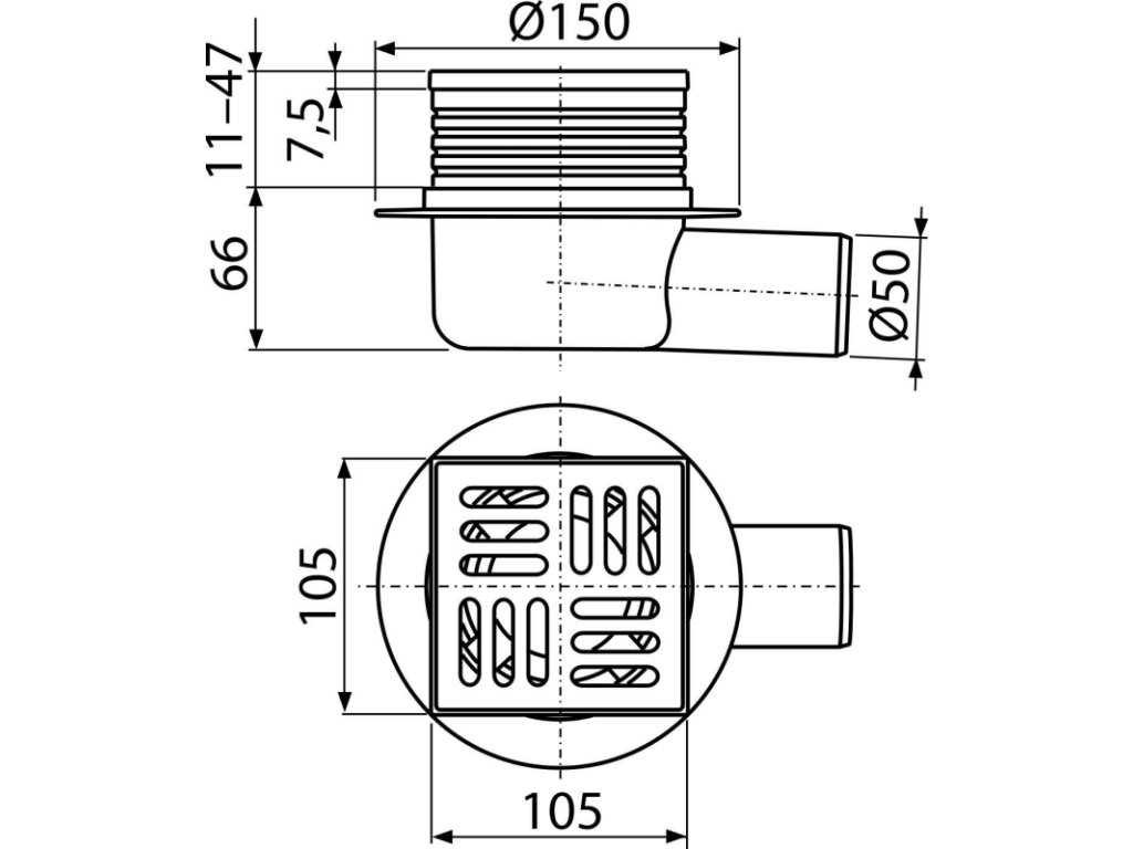 Podlahová vpusť 105×105/50 mm bočná, mriežka nerez, vodná zápachová uzávera