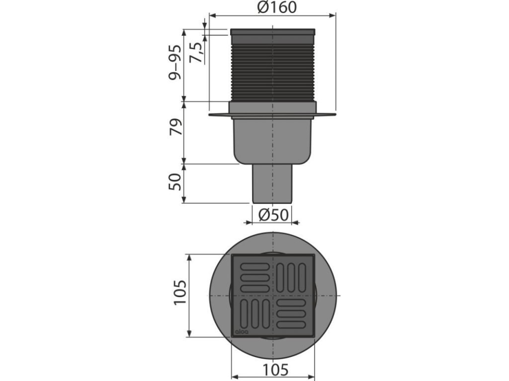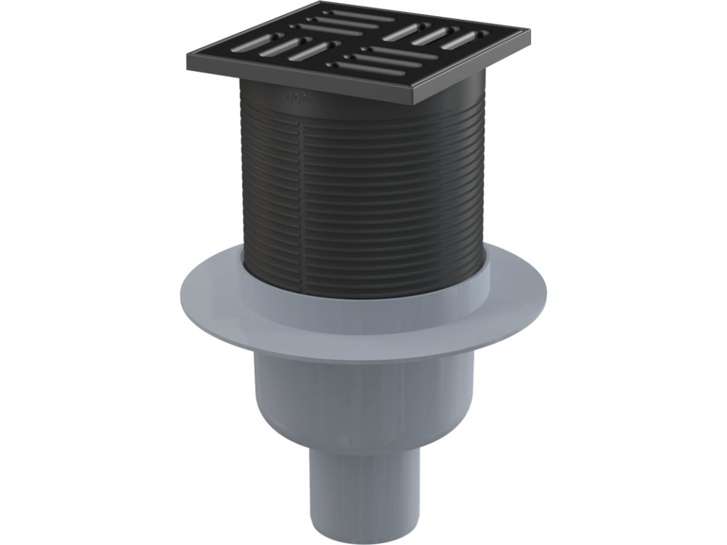 Podlahová vpusť 105×105/50 mm priama, mriežka nerez čierna-mat, kombinovaná zápachová uzávera SMART