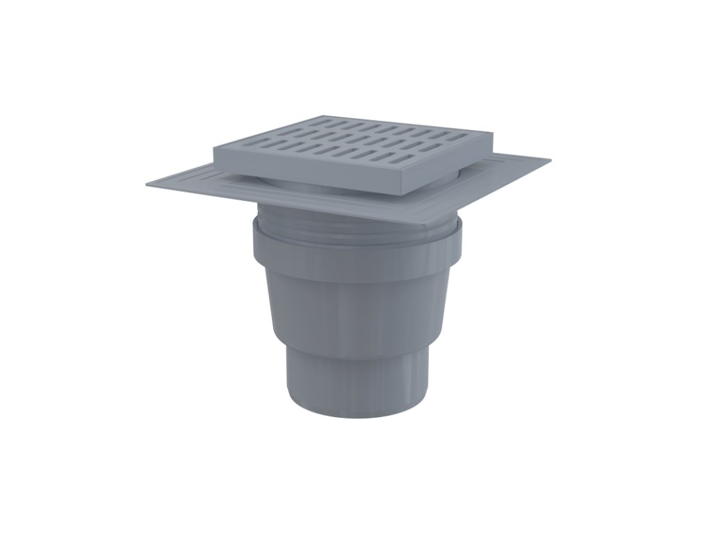 Podlahová vpusť 150×150/110 mm priama, mriežka šedá, límec 2. úrovne izolácie, vodná zápachová uzávera