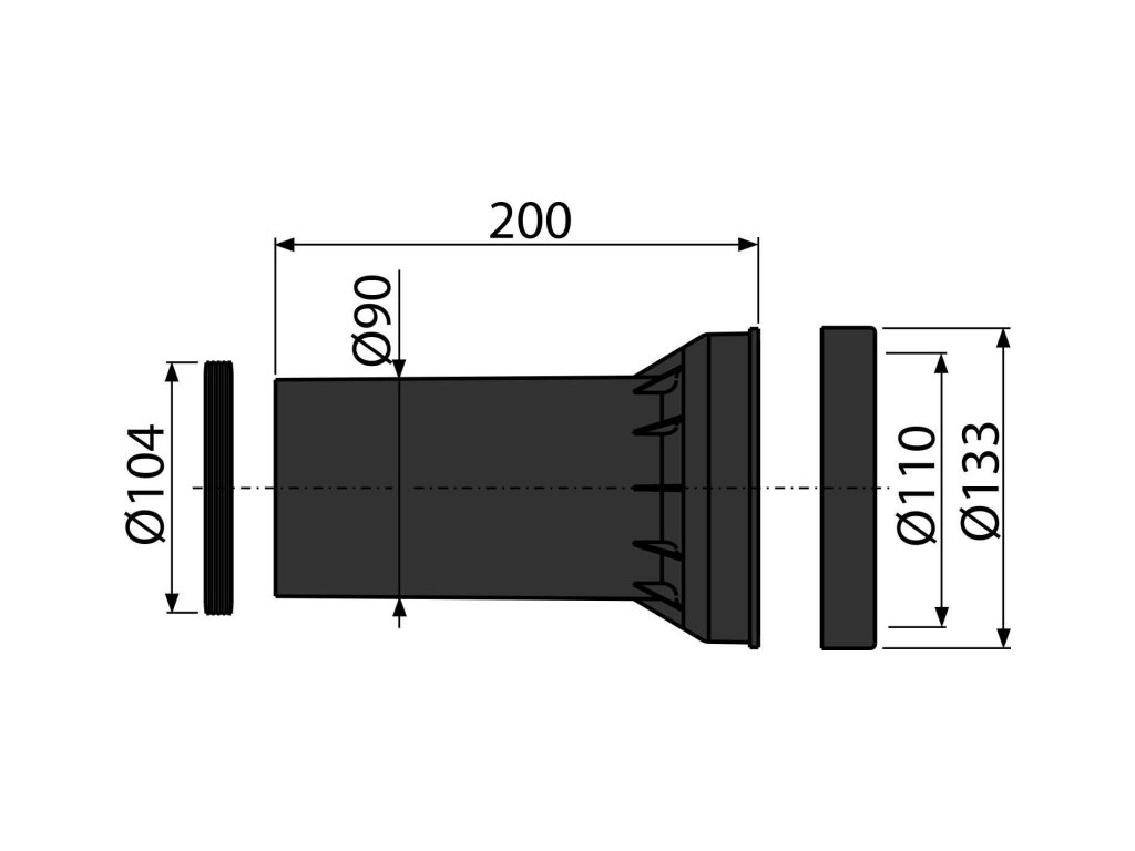 Predĺžené dopojenie k závesnej WC mise, DN 90, dĺžka 200 mm, PE, čierne