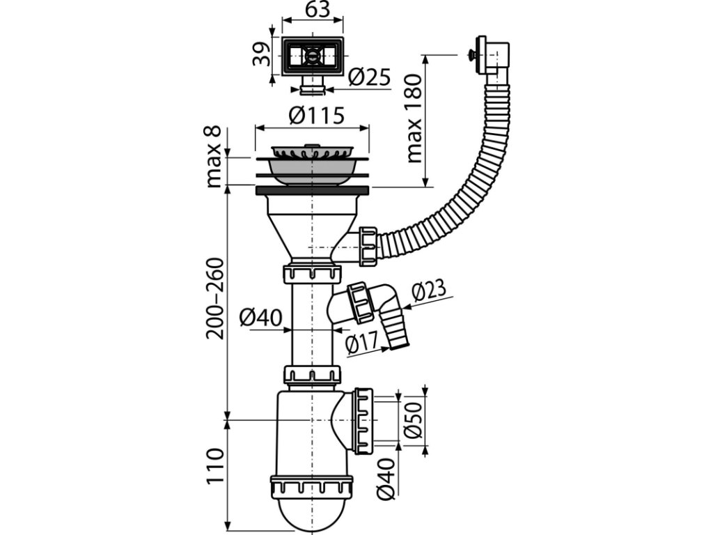 Sifón drezový DN 40/50 s prípojkou Ø 17–23 mm, nerezovou mriežkou Ø 115 mm a flexi prepadom