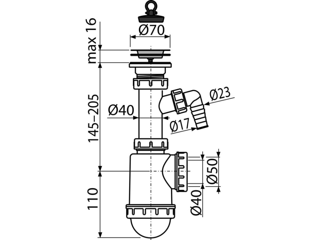 Sifón drezový DN 40/50 s prípojkou Ø 17–23 mm a nerezovou mriežkou Ø 70 mm, gumová zátka