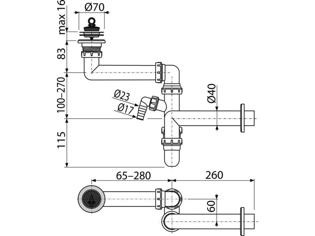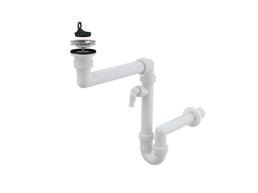 Sifón drezový DN 40 priestorovo úsporný s prípojkou Ø 17–23 mm a nerezovou mriežkou Ø 70 mm, gumová zátka