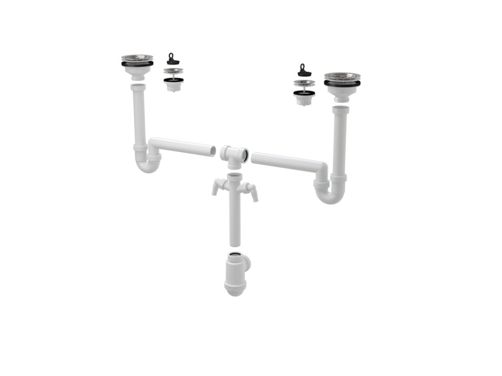 Sifón pre dvojdrez DN 40/50 univerzálny s dvoma prípojkami Ø 17–23 mm, nerezové mriežky Ø 70 mm a Ø 115 mm, gumová zátka