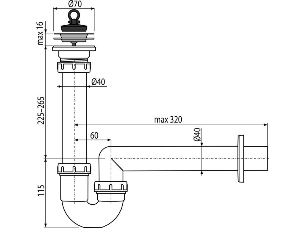 Sifón trubkový drezový DN 40 s nerezovou mriežkou Ø 70 mm, gumová zátka