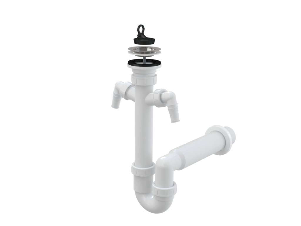 Sifón trubkový drezový DN 50 s nerezovou mriežkou Ø 70 mm a dvoma prípojkami Ø 17–23 mm, gumová zátka
