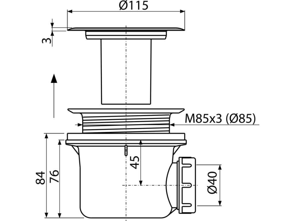 Sifón vaničkový, pre otvor 90 mm, DN 40, mriežka Ø 115 mm, kov, nerez-lesk