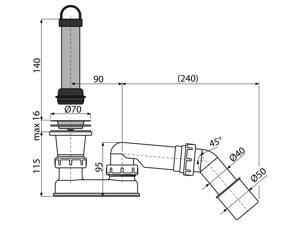 Sifón vaničkový so zápachovou uzáverou a kolenom 45°, pre otvor 50 mm, DN 40/50, kov, nerez-lesk