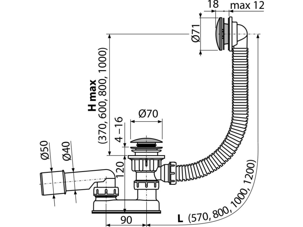 Sifón vaňový CLICK/CLACK, dĺžka 57 cm, kov, chróm-lesk