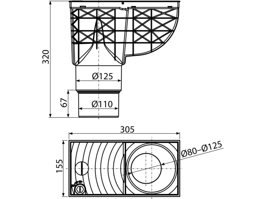 Univerzálny lapač strešných splavenín 300×155/125/110 mm priamy, šedá