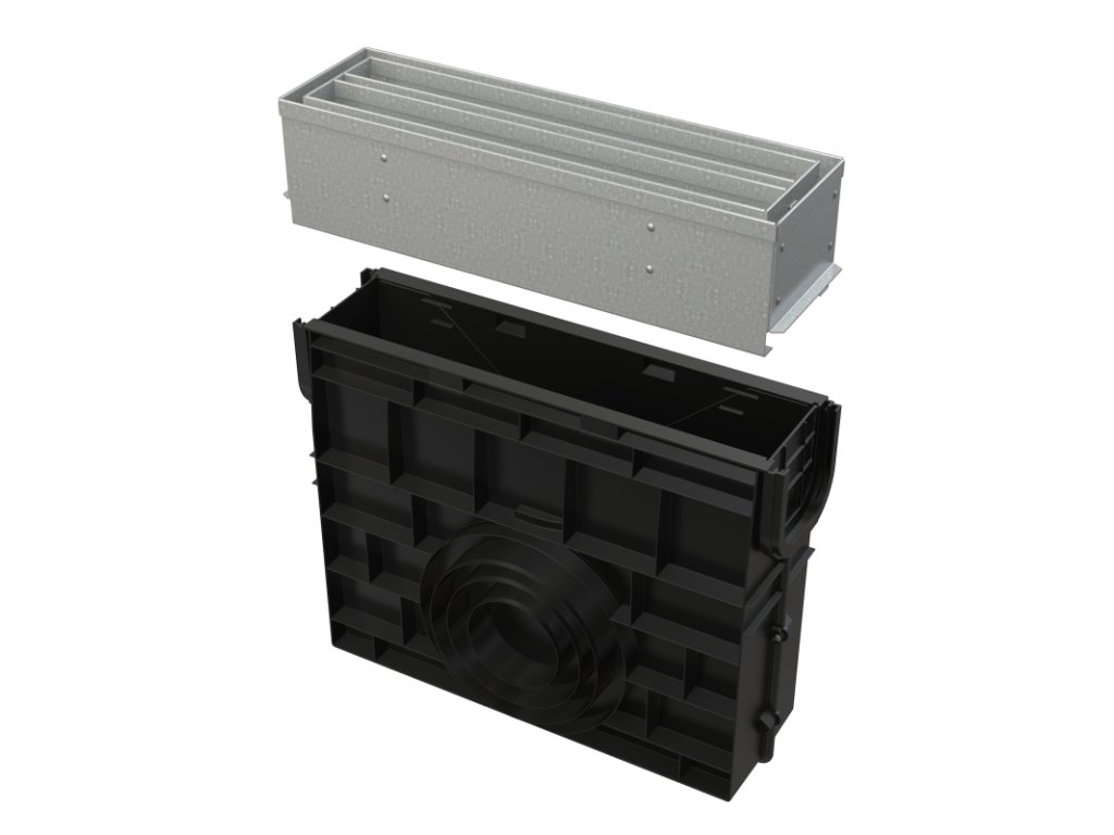 Materiál žľabu: polypropylén plnený mastencom odolný proti mechanickému, chemickému a tepelnému poškodeniu