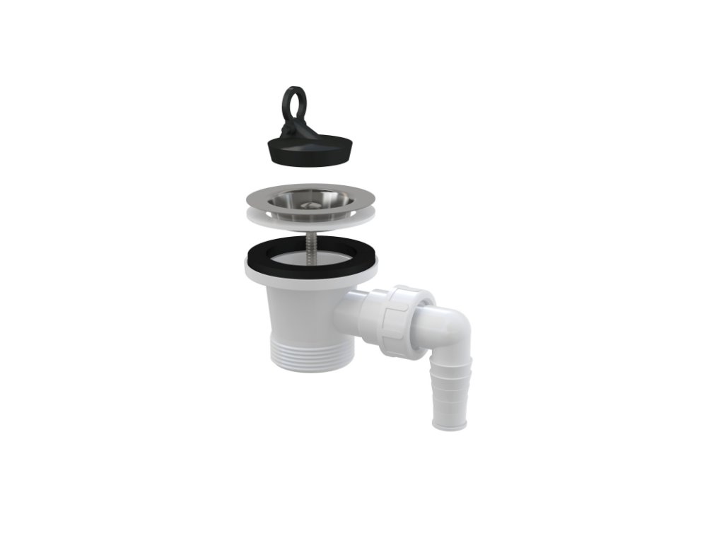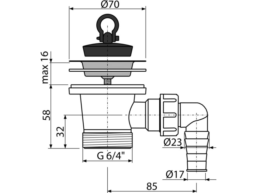 Výpusť drezová G 6/4" s prípojkou Ø 17–23 mm a nerezovou mriežkou Ø 70 mm, gumová zátka